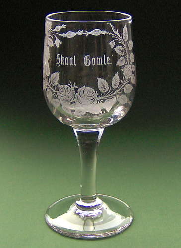 Ølglas bodegatype. På kummen matætset blomsterkrans og heri devisen: "Skaal Gamle"