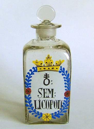 Firkantet flaske med lille hals og udsvajet munding, og tilhørende luftfyldt prop med sammenklemt knop. Dekoreret med emaljemalet flerfarvet skjold med krone over, pulversymbol og teksten "SEM: LICOPOD:" i sort farve på hvid baggrund.