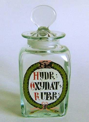 Lavt firkantet glas med lille hals og udsvajet munding, og tilhørende luftfyldt prop med sammenklemt knop. Dekoreret med emaljemalet flerfarvet skjold med teksten "HYDR: OXYDAT: RUBR:" i sort og rød farve på hvid baggrund.
