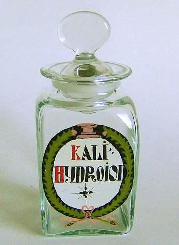 Lavt firkantet glas med lille hals og udsvajet munding, og tilhørende luftfyldt prop med sammenklemt knop. Dekoreret med emaljemalet flerfarvet skjold med teksten "KALI: HYDROIOD" i sort og rød farve på hvid baggrund.