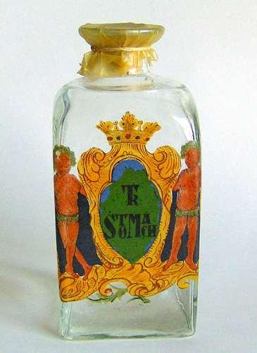 Firkantet glas med lille hals og udsvajet munding. Dekoreret med emaljemalet flerfarvet skjold med to vildmænd, krone og teksten "TR STOMACH" i sort og rød farve på grøn baggrund.