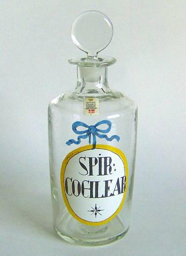 Rund flaske med lille hals og udsvajet munding, tilhørende massiv prop med sammenklemt knop. Dekoreret med emaljemalet flerfarvet skjold med sløjfe over, og teksten "SPIR: COCHLEAR" i sort farve på hvid baggrund.