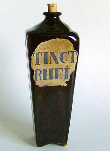 Høj mørkebrun firkantet konisk flaske med lille hals og udsvajet munding, og tilhørende korkprop, samt opstukket bund med fire små ben. Dekoreret med emaljemalet brunt felt med teksten "TINCT RHEI" i sort farve.