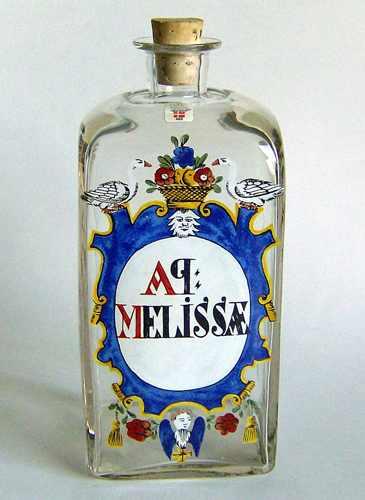 Høj firkantet flaske med lille hals og udsvajet munding, og tilhørende korkprop. Dekoreret med emaljemalet flerfarvet skjold med to gæs, og teksten "AP: MELISSÆ" i sort og rød farve på hvid baggrund.