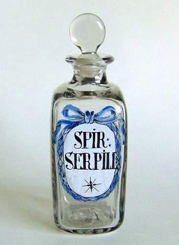 Firkantet flaske med lille hals og udsvajet munding, og tilhørende sammenklemt massiv rund prop. Dekoreret med emaljemalet flerfarvet skjold med sløjfe over, og teksten "SPIR: SERPILL" i sort og brun farve på hvid baggrund.