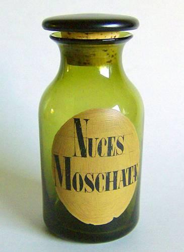 Grønt rundt glas med indsnævring under udsvajet munding, og opstukket bund. Dekoreret med emaljemalet gråbrun oval med teksten "NUCES MOSCHATÆ" i sort farve. Tilhørende sortmalet trælåg med korkprop.