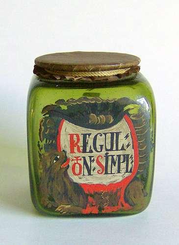 Grønt lavt firkantet glas med indsnævring under udsvajet rand. Dekoreret med emaljemalet flerfarvet skjold med hund ved siden, og teksten "REGUL: ON: SIMPL:" i sort og rød farve på hvid baggrund.