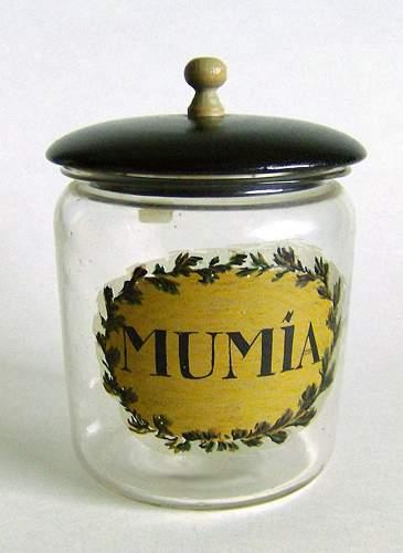 Lavt cylinderformet glas med indsnævring under udsvajet rand. Dekoreret med emaljemalet bladkrans og teksten "MUMIA" på beige farvet bund. Tilhørende sortmalet trælåg med lille knop.