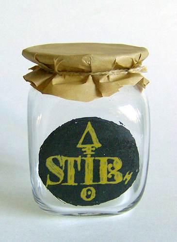Lille firkantet glas med indsvævring under udsvajet munding. Dekoreret med emaljemalet rundt felt, med det alkymistiske tegn for svovl og teksten "STIB" i olivengul farve på sort baggrund. Dette glas er det ene af to fra 1992.