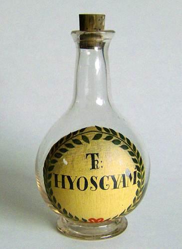 Dråbeformet flaske med lille ringfod og udsvajet munding, med tilhørende korkprop. Dekoreret med emaljemalet grågult felt og bladkrans, med teksten "TR:HYOSCYAM" i sort farve.
