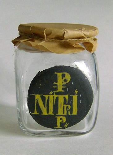 Lille firkantet glas med indsvævring under udsvajet munding. Dekoreret med emaljemalet rundt felt, med teksten "P NITRI P" i olivengul farve på sort baggrund.