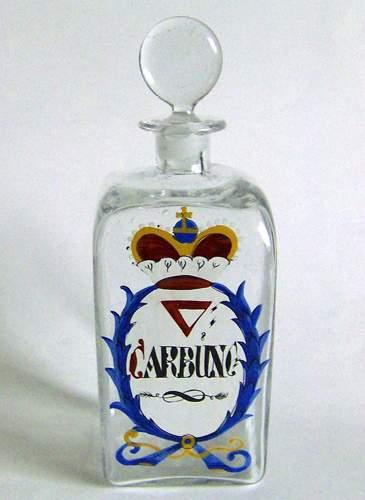 Firkantet flaske med lille hals og udsvajet munding, og tilhørende sammenklemt massiv rund prop. Dekoreret med emaljemalet flerfarvet skjold med krone over, og teksten "CARBUNC:" i sort og rød farve på hvid baggrund.