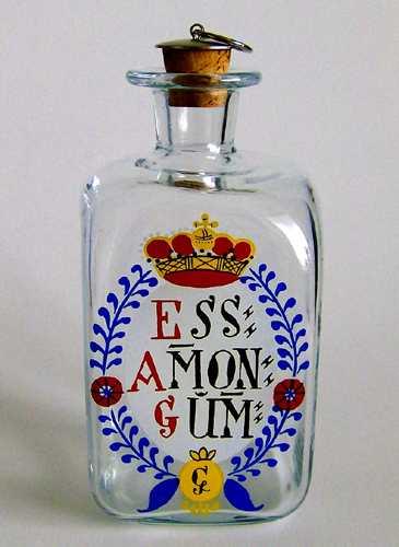 Firkantet flaske med lille hals og udsvajet munding, og tilhørende korkprop med metalring. Dekoreret med emaljemalet flerfarvet skjold med krone over, og teksten "ESS: AMON: GUM:" i sort og rød farve på hvid baggrund.