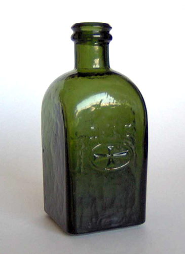 Mundblæst 1/4 liter firkantet CLOC flaske, på to sider D.S.C. over et malteserkors i oval (Dansk Sprit Central - var en afdeling under De Danske Spritfabrikker) . Bundmærkning: Flad rund opstikning Holmegaards ell.