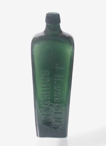 Mundblæst Geneverflaske med kvadratisk tværsnit. Tekst lodret på korpus "J.H. van GENT SCHEIDAM". "van Gent" genever blev forhandlet af firmaet Carl Wandel & søn. ca. 1880.
