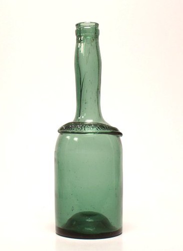 Mundblæst Arrakflaske, med båndsegl, i seglet stemplet teksten "JACOB MINI & SØNNER", mundstykke lavet v.h.a. omlagt rigle. Meget sjælden, findes sandsynligvis kun i dette ene eksemplar. Venligst udlånt fra Poul Lyngs samling.
