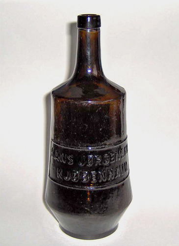 Brun mundblæst whiskyflaske, stærkt hamret, på korpus stort firkantet felt med teksten: HANS JØRGENSEN KJØBENHAVN