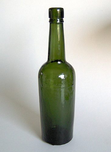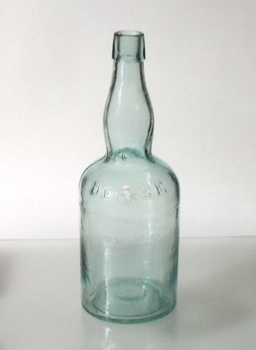 Stærkt hamret snapseflaske med prop mundstykke, på korpus D.D.S.F i ramme, og i bunden malteserkors i oval.