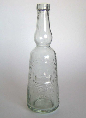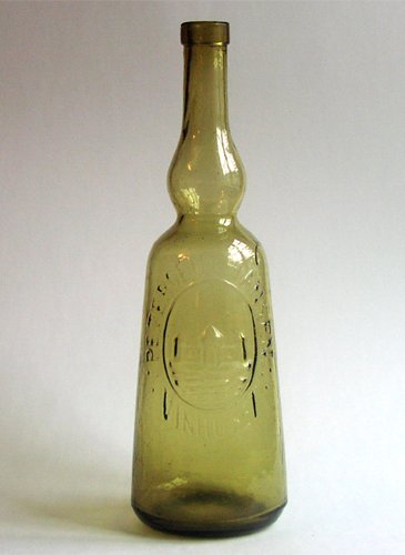 Mundblæst Svendborg flaske til solbærrom eller pebermyntelikør. På korpus: "Svendborg byvåben og PETERSEN & HANSEN - VINHUSET". Bundmærkning: Flad rund opstikning.
