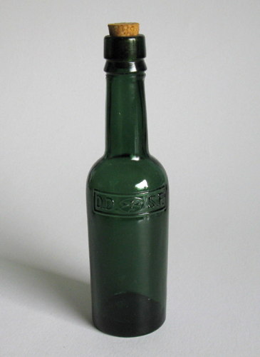 Lille mørkegrøn maskinblæst snapseflaske, der populært kaldes en "kylling" med prop mundstykke, på korpus "D.D.(Malteserkors)S.F" i ramme. Bundmærke: Et malteserkors i oval.