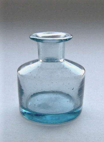 Lille rund mundblæst blækflaske, med skulder, hals og lille udsvajet rand. Ring om skulder og fod.
