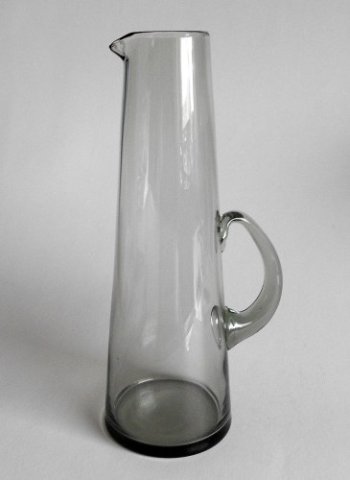 Høj slank konisk 1½ liter kande blæst i smoke farvet glas, med lille hældetud og påsat hank forneden.