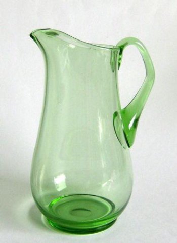 Ædelgrøn balusterformet kande med sammenklemt hældetud til stop for isterninger, påsat hank og kuglet i bund.