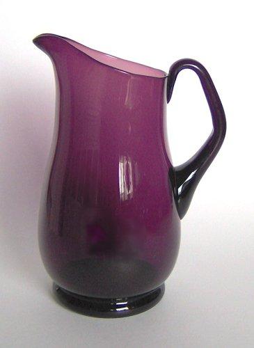 Violet balusterformet kande med hældetud og påsat massiv hank. Kuglet i bund.