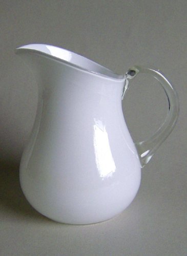 Pæreformet kande med høj stor hældetud, blæst i opalhvidt glas med klart overfang, påsat luftfyldt hank i klart glas. Kuglet i bund.
