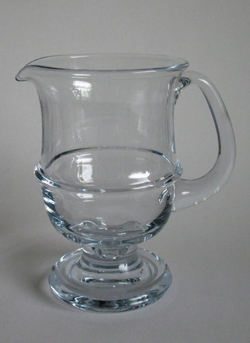 Kraftig kande på fod fra barserien "Fyrskib" med hældetud og påsat hank, om bugen massiv rigle, blæst i klart krystalglas.